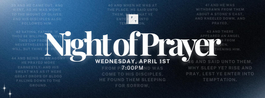 Join us the Wednesday, April 1st at 7PM for a special Night of Prayer.Jesus took time to pray in the Garden of Gethsemane before the crucifixion and said, "Watch and Pray, lest ye enter into temptation"We want to make sure we emphasize prayer and understand the importance that it should have in each of our lives.It will be an awesome time of prayer, music, and some light refreshments.